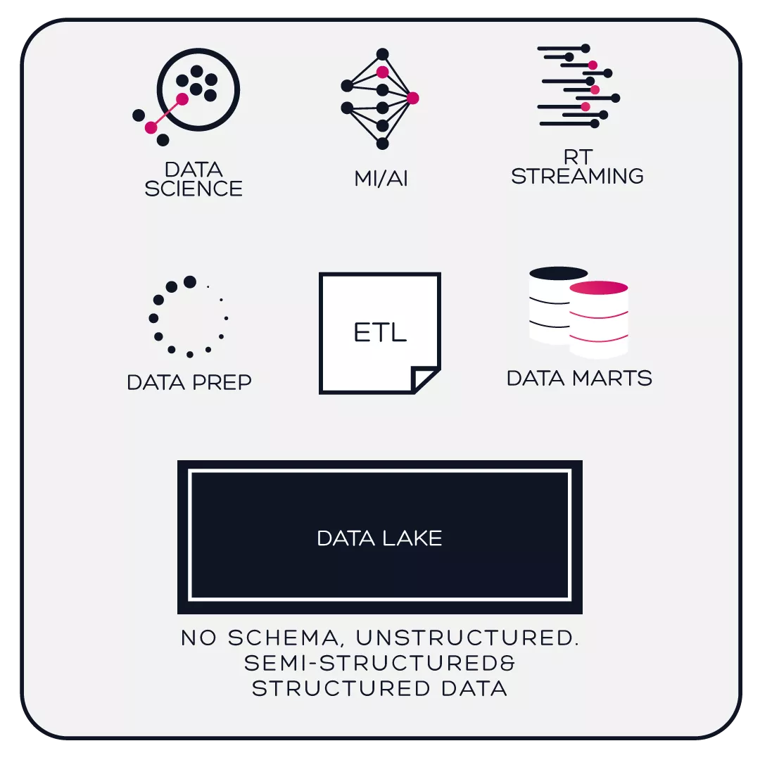 A data lake is a centralized repository designed to store, process, and secure large amounts of structured, semistructured, and unstructured data. It can store data in its native format and process any variety of it, ignoring size limits.